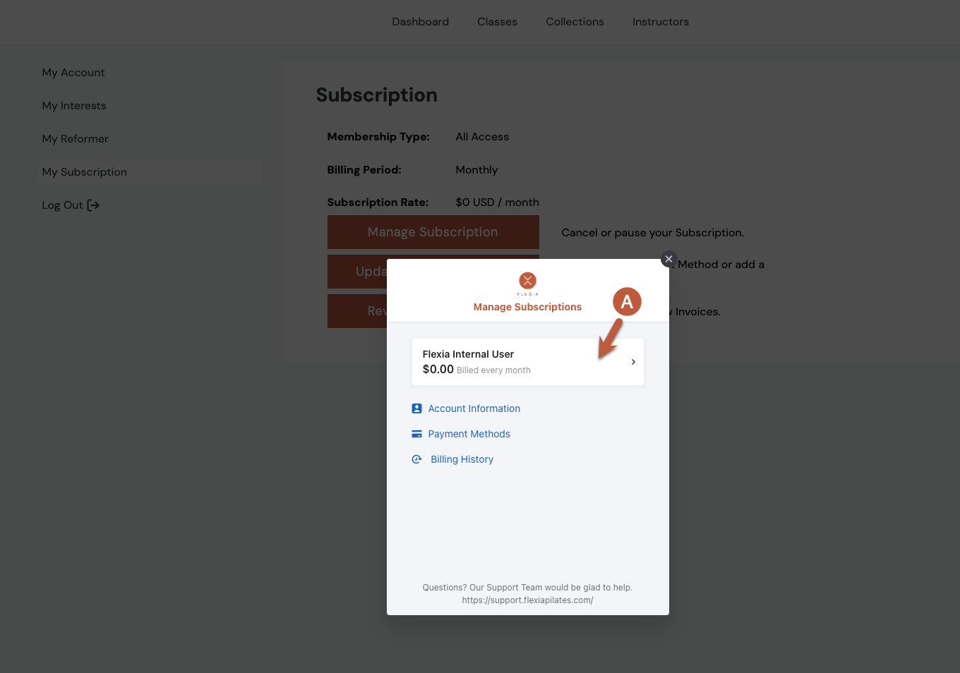 | 3 | The Manage Subscription screen will open. A - Click on your current subscription box. |