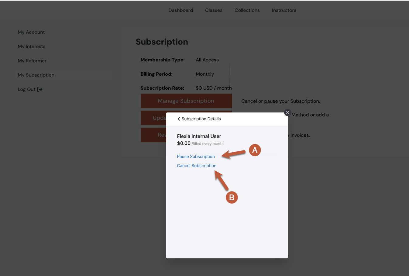 | 4 | The Subscription Details screen will open. A - Select "Pause Subscription" to temporarily pause billing and access the Online Studio. or B - Select "Cancel Subscription" to cancel your subscription permanently. |